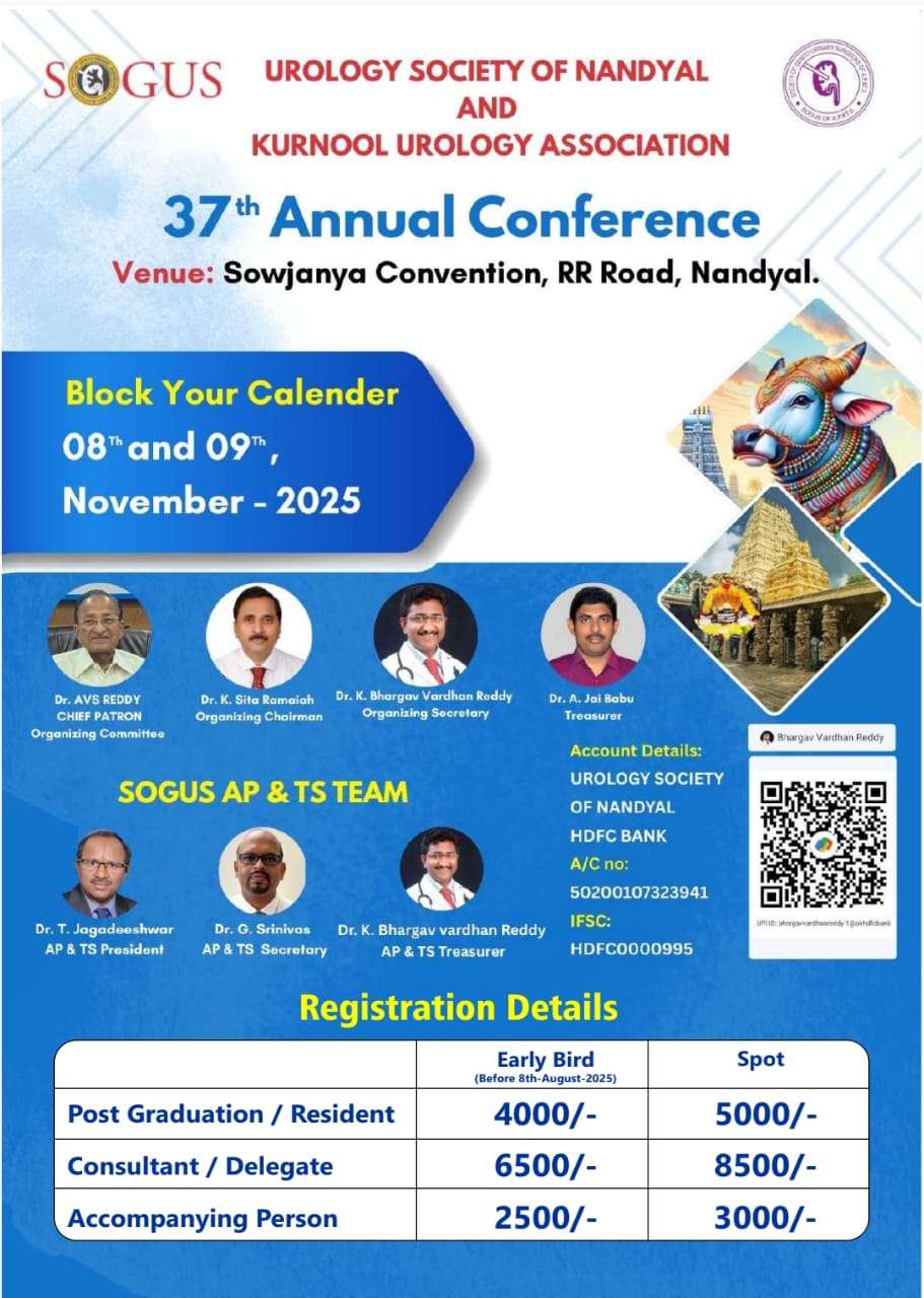 The ‘Society of Genito Urinary Surgeons of Andhra Pradesh and Telangana’ is formed by the eminent Urlogists & Genito-Urology surgeons from Hyderabad an other parts of AP for research and treatment of urologic diseases. The society is registered vide Registration No 430 of 2014 by Registrar of Society, Govt. of Andhra Pradesh under the Andhra Pradesh Societies Registration Act, 2001. At inception a provisional Executive Committee with Dr. Mallikarjun Reddy as the Chairman was entrusted with the task of framing the rules, enrolling members. The society is a professional association of the Urologists of Andhra Pradesh, that aims at